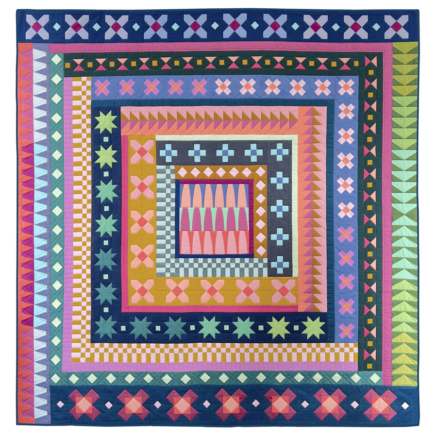 Pages 23 & 29: The diagram shows the dark pink in the Hourglass Row facing the outside of the block. This is incorrect and the correct orientation of the row is shown on the cover quilt.